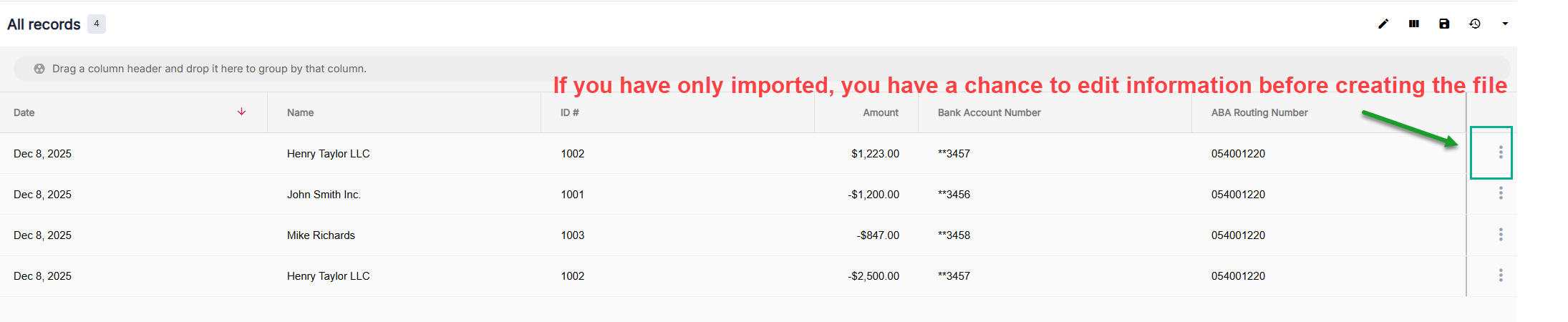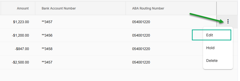Here, when clicking on the 3 dots at the right side, it is possible to edit a record to make changes, hold the transaction, or delete it altogether.