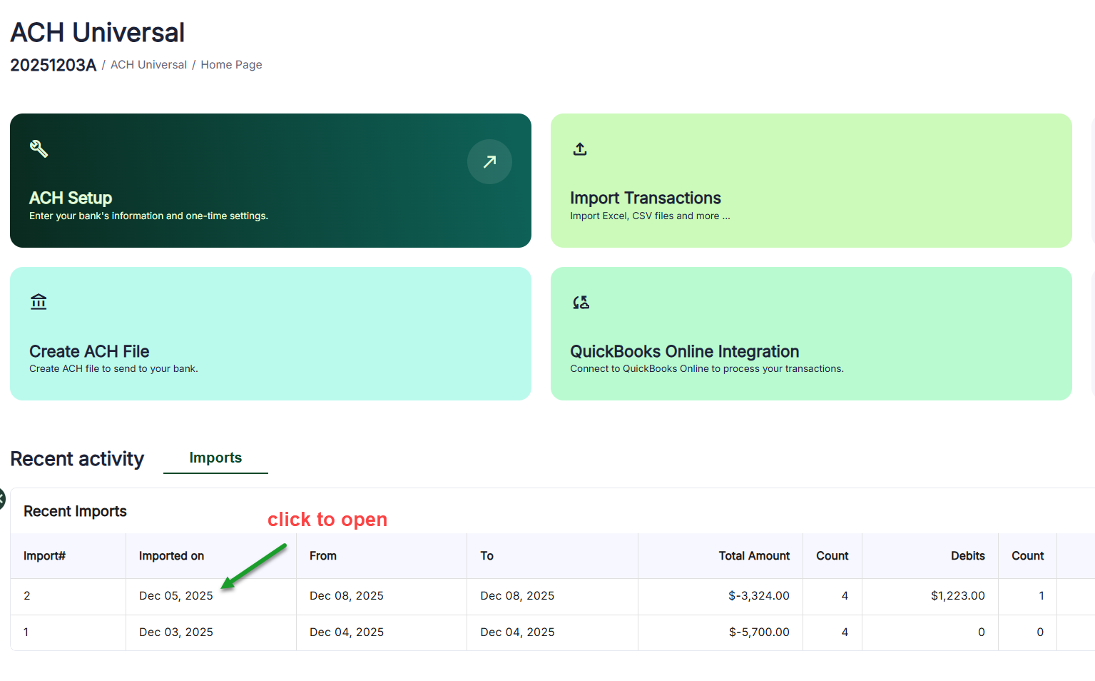 On the Home Page the recent imports are shown at the bottom of the screen. Click on the import to see the detail.