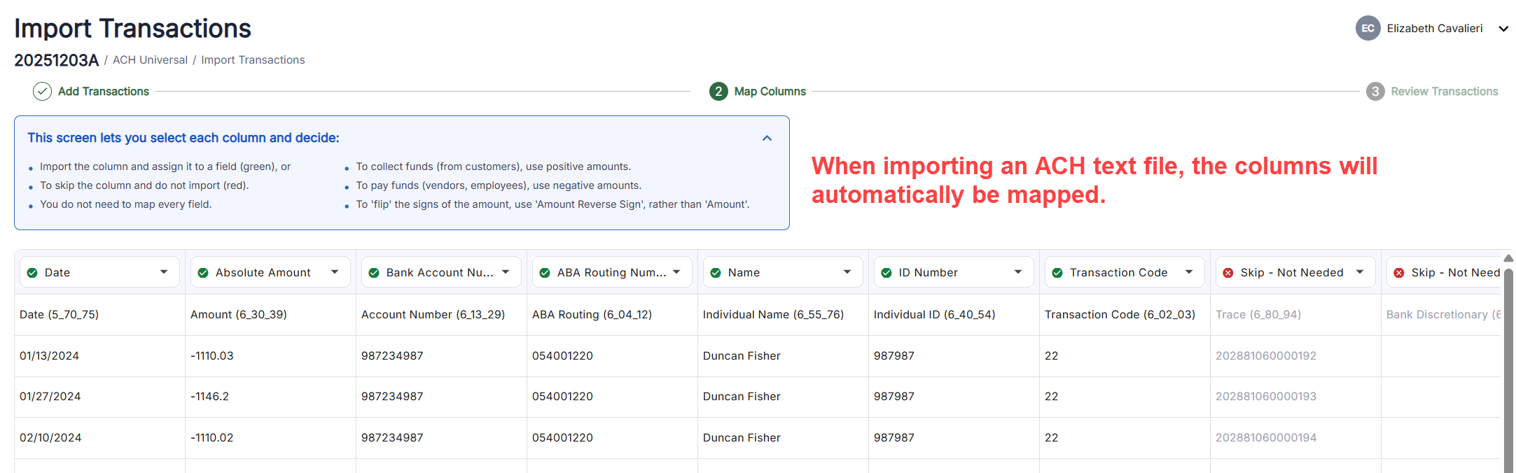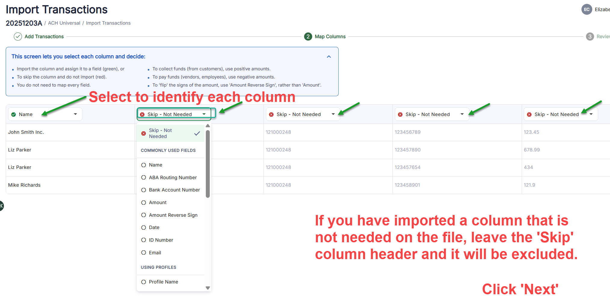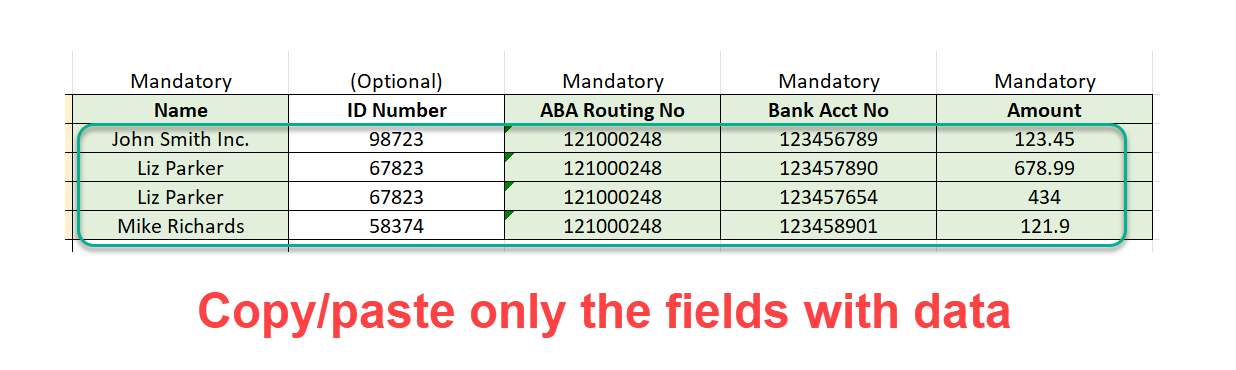At a minimum, you will need a Name, ABA Routing Number, Bank Account Number, and Amount (or Amount Reverse Sign)