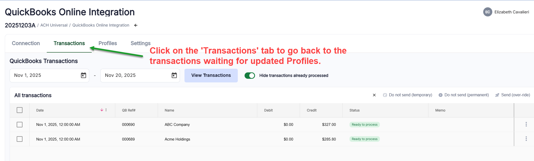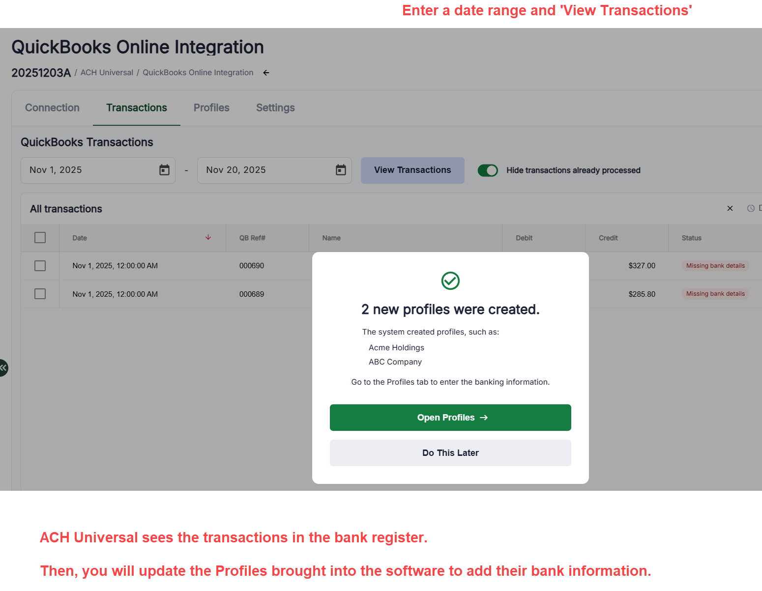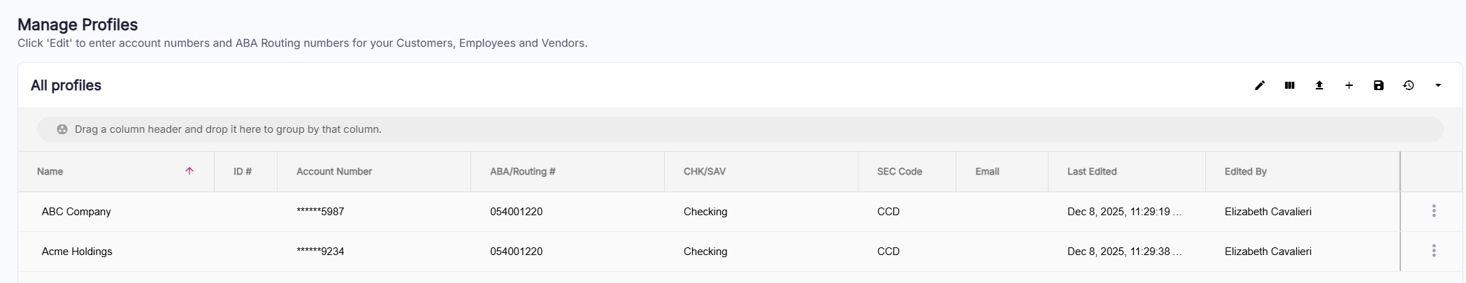 Click on 'Open Profiles' and then 'Edit' each Profile to include their bank and/or email information.