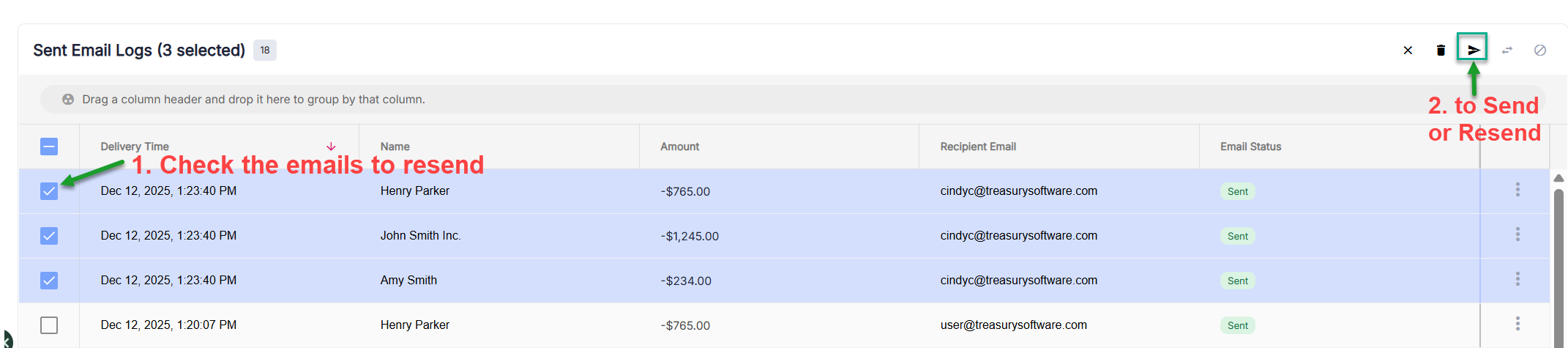 Then check off the emails you want to resend click the icon to resend them.