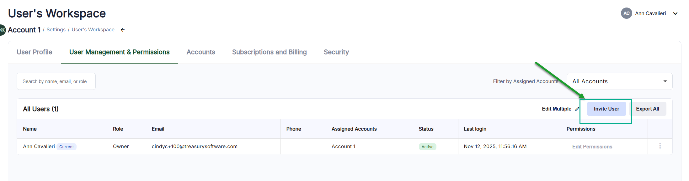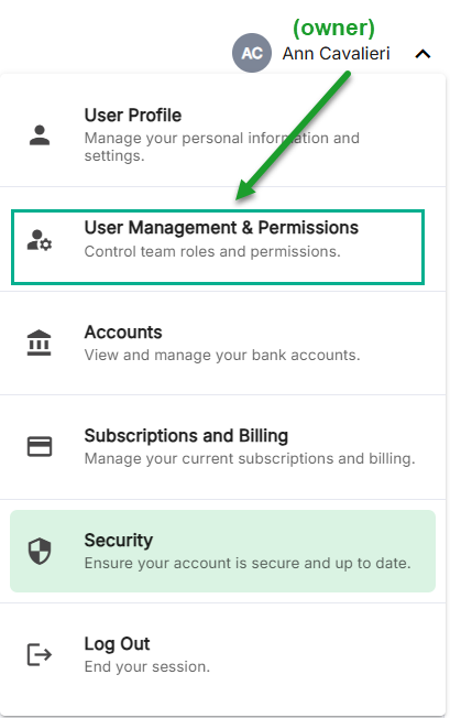 An Owner/Admin can edit a User's permissions by clicking on 'User Management and Permissions':