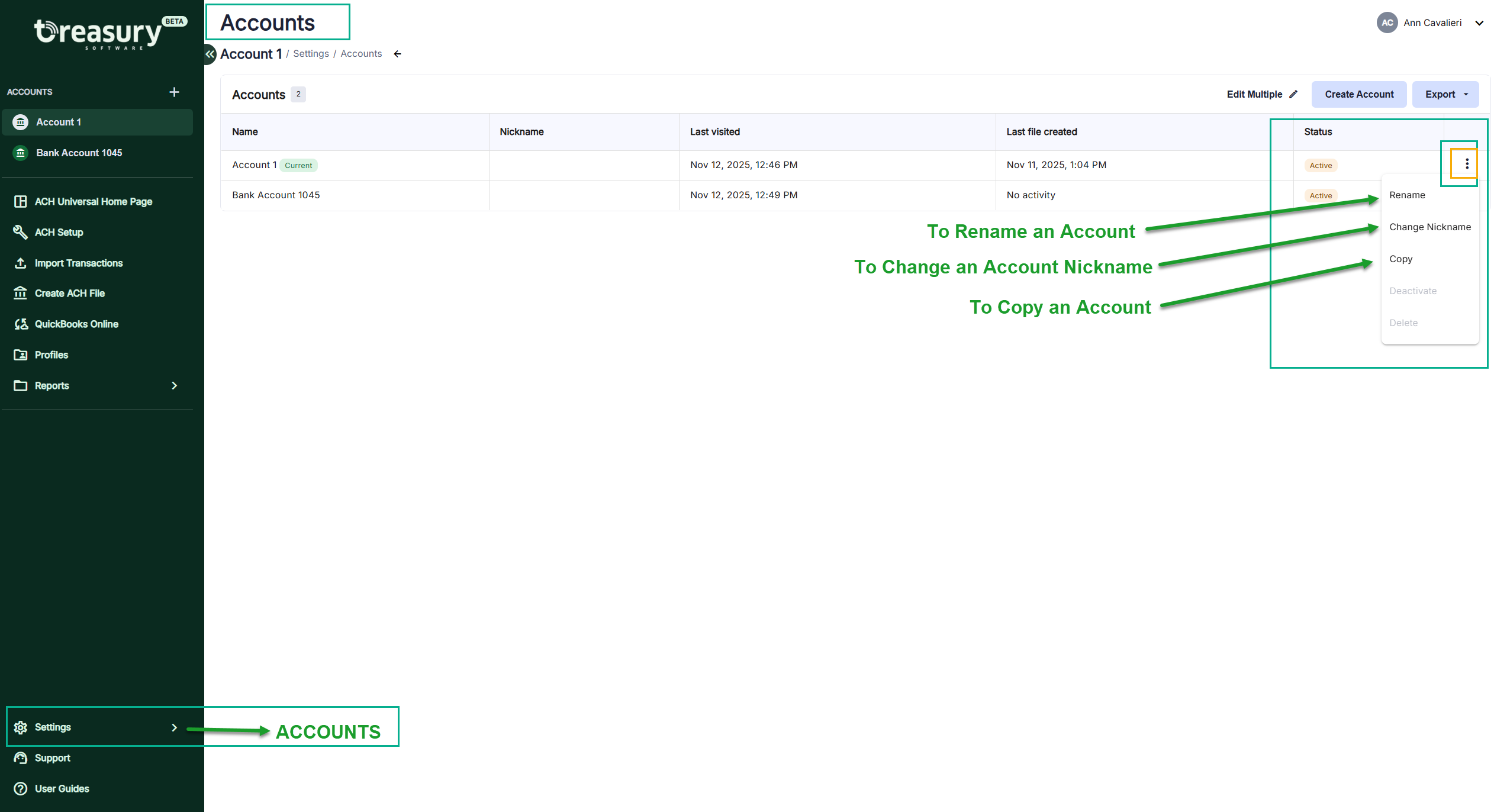 The three stacked dots on the far right can be clicked to make changes to an account name or copy an account.