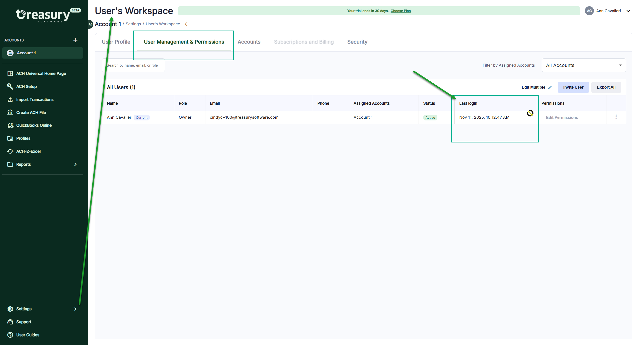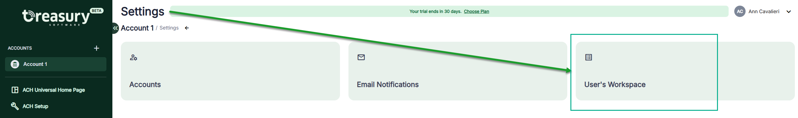 User activity can be tracked in ACH Universal Online by clicking on 'Settings' (at the bottom left corner) > User's Workspace