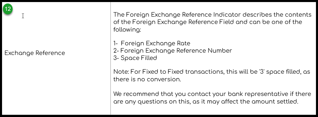 Acceptable values (one digit): '1' (Foreign Exchange Rate); '2' (Foreign Exchange Reference Number); or '3' (Space). Describes content of Foreign_Exchange_Rate field. Tip: If Foreign Exchange Indicator is FF, then this entry should be '3' (space filled). |